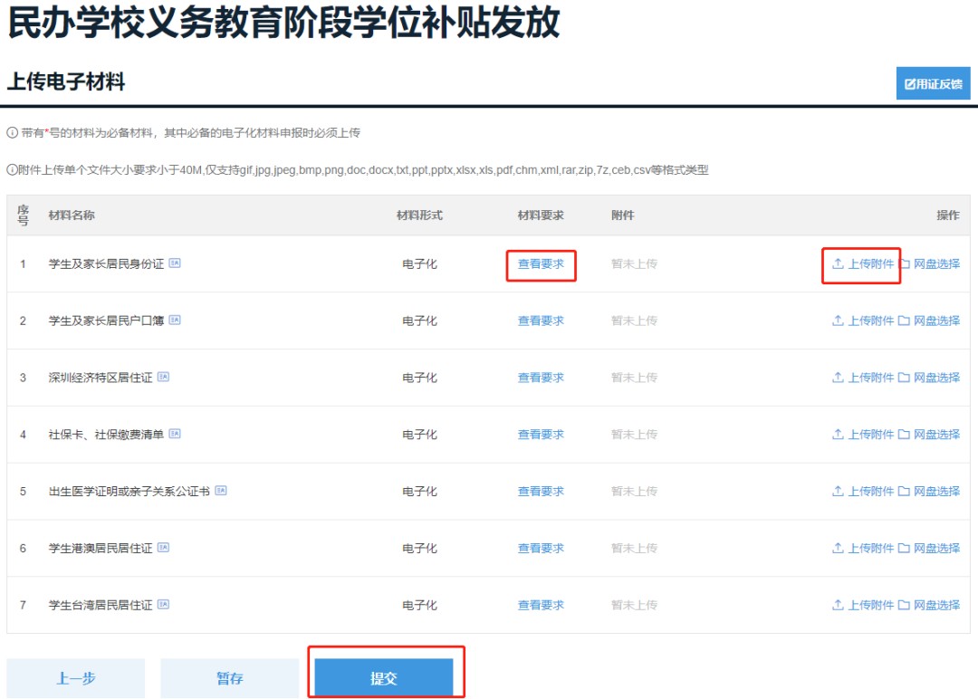 在上一步中进行“社保及居住证查询”,验证结果为“不通过”的,若确实符合条件的申请人,请上传相关材料,以便业务人员进行核对。点击“提交”,即可办理完成。
