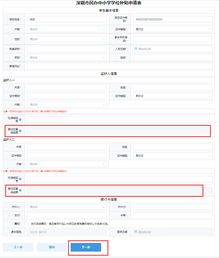 2.非深户学生,需将符合申报条件(有居住证)的监护人信息填入“监护人一”或“监护人二”处,准确填写监护人身份信息,查询居住证是否符合条件(若确实符合条件而系统判定为不通过,请上传相应佐证材料供人工审核)。
