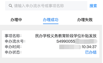 申请“民办学校义务教育阶段学位补贴发放”事项完成后,返回光明区子门户-首页中,找到“办事查询”,可以进入【办事进度查询】页面。