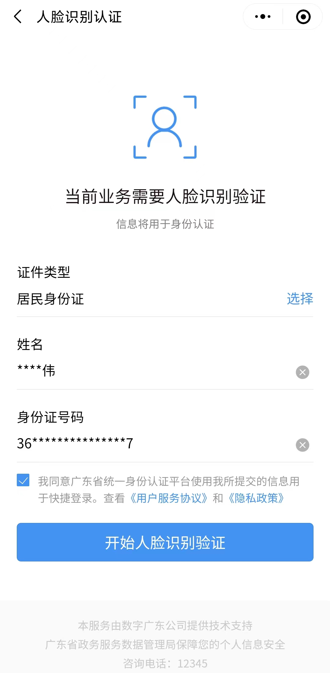 在【人脸识别认证】页面,仔细检查个人信息是否准确,如准确无误的话,再点击勾选“我同意广东省统一身份认证平台使用我所提交的信息用于快捷登录。查看《用户使用协议》和《隐私政策》”,然后点击“开始人脸识别验证”按钮。