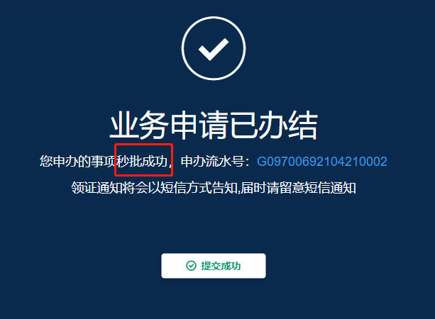系统自动发送含流水号的秒批通过及办结短信提醒。