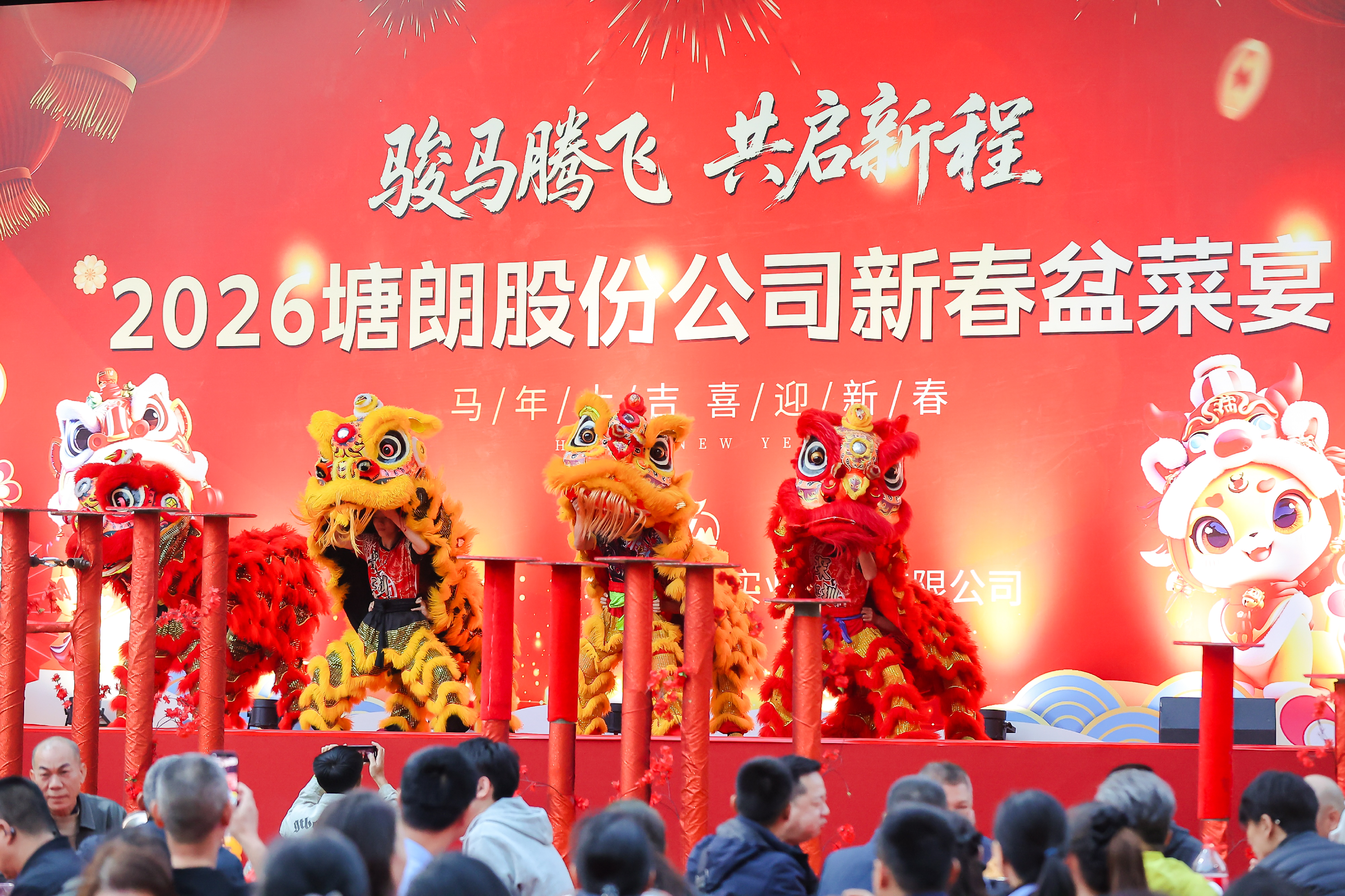 活动在精彩的梅花桩舞狮表演中拉开序幕,矫健灵动的醒狮腾跃辗转,赢得现场满堂喝彩。随后,一盆盆热气腾腾的盆菜陆续上桌,鲜虾、鲍鱼、瑶柱等食材层层铺陈,香气扑鼻,饱含“团圆美满、盆满钵满”的美好寓意。