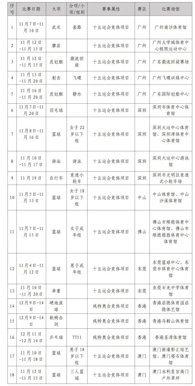 游泳、羽毛球、篮球(男子成年组、女子成年组)四个备受公众关注的项目,在本次售票中首度开放购票。其中,游泳项目将于11月10日至17日在深圳大运中心游泳馆举行。羽毛球项目将于11月7日至20日在深圳市体育中心体育馆举行。篮球项目男子成年组赛事将于11月4日至12日在东莞篮球中心、东莞市体育中心体育馆举行。篮球项目女子成年组赛事将于11月7日至11月15日在佛山市顺德体育中心体育馆、佛山市顺德德胜体育中心体育馆举行。