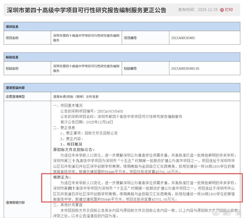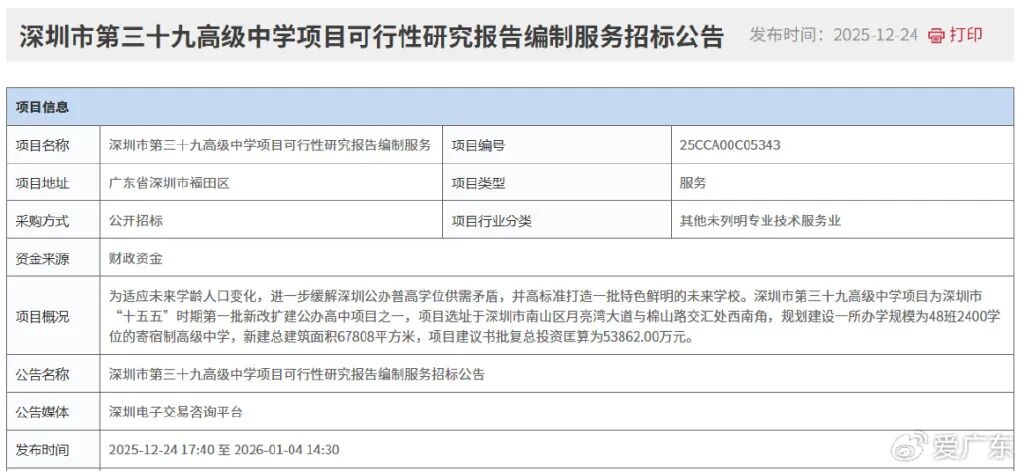 据招标公告介绍,这四所高中都是深圳市“十五五”期间项目。