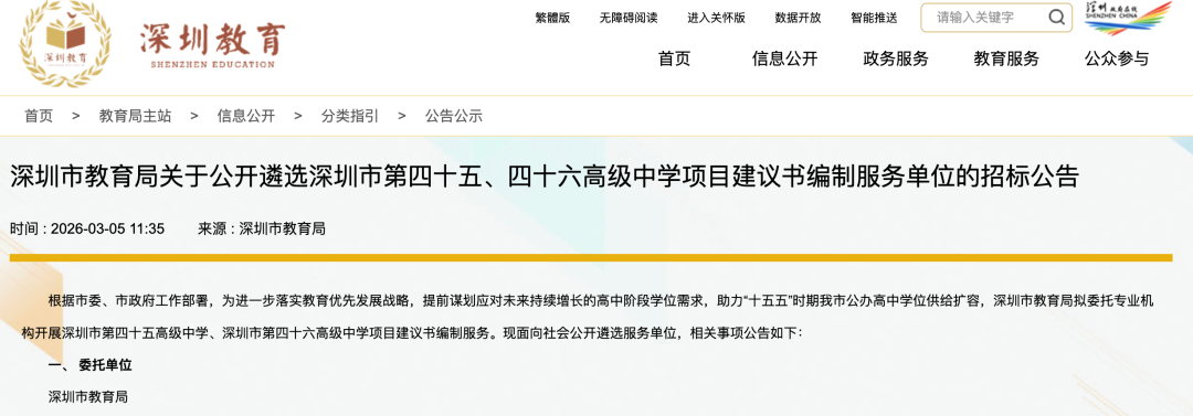 近日,深圳市教育局官网连续发布两则招标公告,分别是《关于公开遴选深圳市第三十九、第四十高级中学项目社会稳定风险评估报告编制服务单位的招标公告》以及《关于公开遴选深圳市第四十五、四十六高级中学项目建议书编制服务单位的招标公告》。